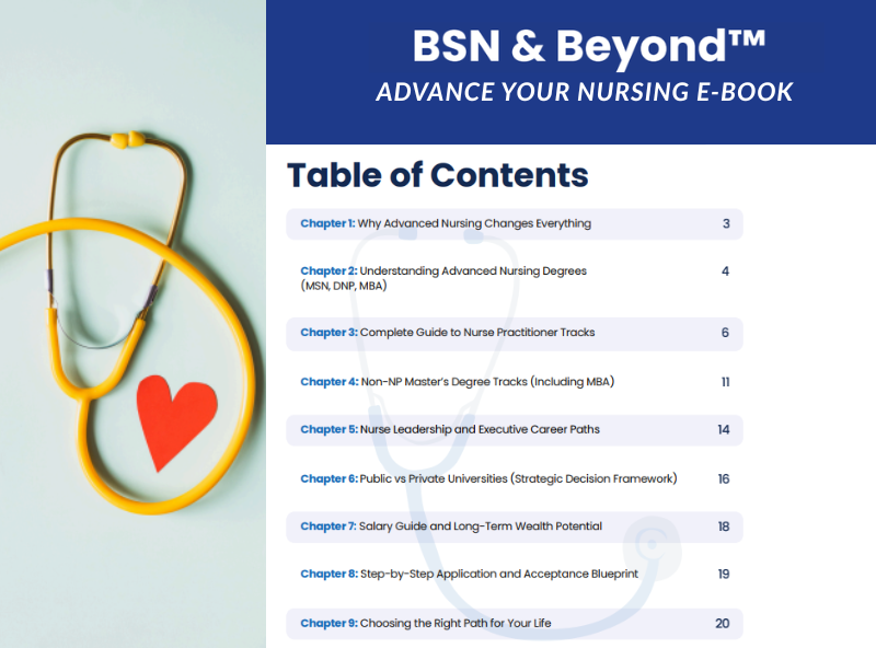 This 27-page e-book + workbook will allow you to discover advanced paths beyond the bedside and unlock where your nursing career can actually take you. You worked hard to become a nurse, but now you're asking a bigger question: What's next? If you've ever felt unsure about which advanced path to pursue-- or worried about choosing the wrong one-- this is for you!